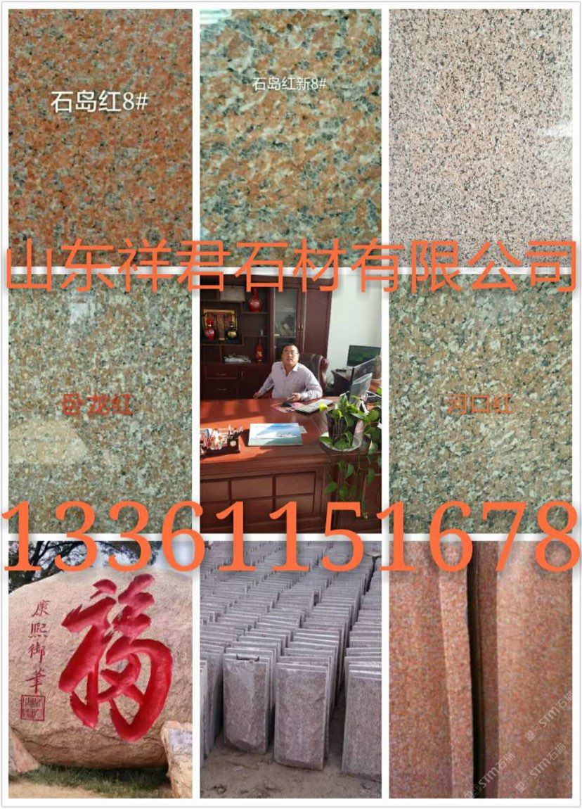 山東榮成市祥君石材有限公司廠價直銷!石島紅!!櫻花紅!!榮成灰!!皇室冰花??!皇室瑪瑙 ?。? 紫晶鉆!!皇室珍珠!!皇室玫瑰!!皇室啡!!皇室棕鉆!!中磊紅!!龍須紅!!白麻!!黃金麻??!中國棕!!文登灰!等山東石材及異型加工。全自動磨光,大型噴砂機.紅外線切割。
