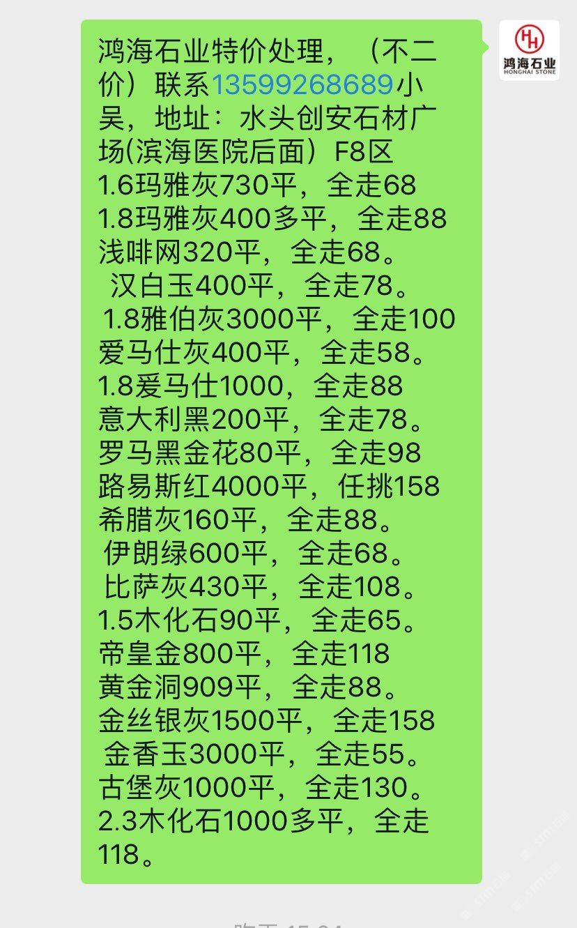鴻海石業(yè)-現板5萬平特價處理,(不二價)聯系13599268689小吳,地址:水頭創(chuàng)安石材廣場(濱海醫(yī)院后面)F8區(qū) 1.8絲綢白3000平,150起 1.8金絲銀灰7500平,100起1.8夢幻藍4500平,100起。1.8卡拉垃白一150元起。 1.8藍色星球1300平,150起水墨年華6000平全走78。 1.8午夜星河1300平,150起1.8多蘭戈(紅色)300平,柏斯高灰2000平,全走88 新瑪雅灰3500平,全走88 1.5瑪雅灰200多平,全走68 星塵灰400平,全走88。 愛馬仕灰7500平,全走78 羅馬黑金花60平,全走88 黃金洞909平,全走88。 金香玉300平,全走50。 古堡灰1000平,全走99。 云?;?00多平全走128。2.3木化石100平,全走128。