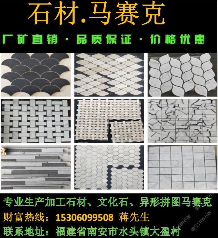 廈門摩恩石材馬賽克工廠是生產馬賽克、大理石、拼花、石線等石材的專業(yè)工廠,工廠成立15年誠信合作,價格公道,以質量求生存,歡迎來廠參觀、詢價、考察下單。我們的工廠負責人蔣先生隨時恭候您的光臨,電話:15306099508,微信:15306099508 qq:1043118173