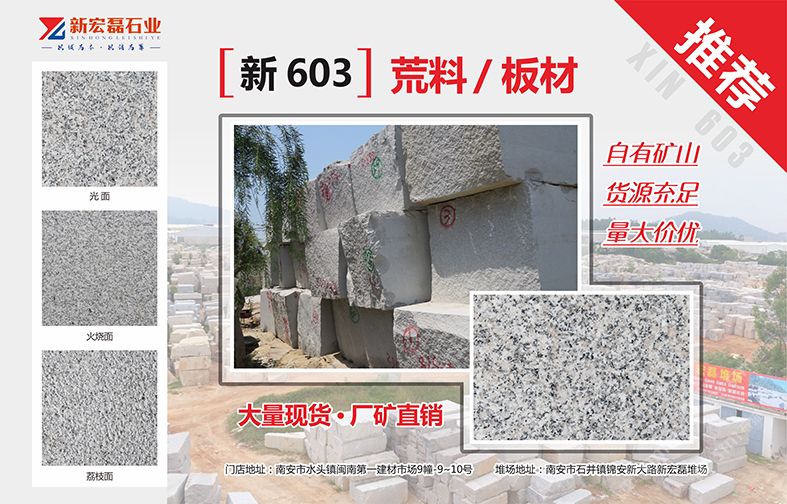 新宏磊石業(yè)有限公司自有礦山,荒料堆場50余畝,有花崗巖和大理石加工廠,是集礦山開采、板材生產(chǎn)加工、銷售出口為一體的綜合性石材供應(yīng)商,在石材行業(yè)已經(jīng)擁有10年以上的生產(chǎn)與銷售經(jīng)驗(yàn)。