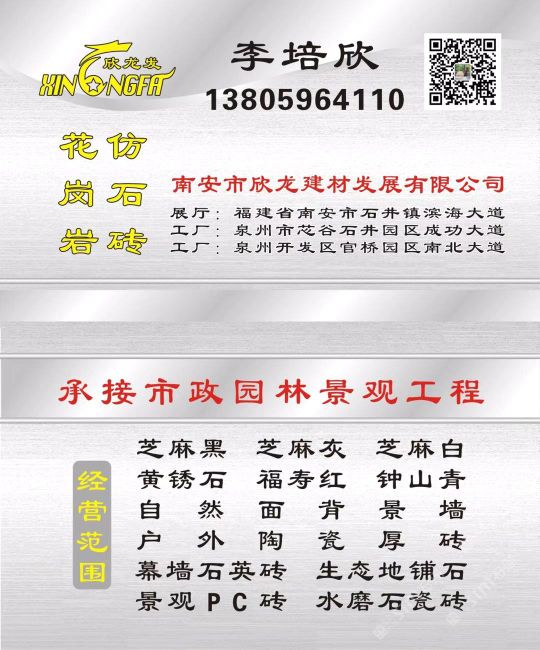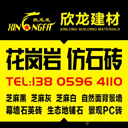 南安市欣龍建材發(fā)展有限公司,位于建材之鄉(xiāng)—福建省南安市石井鎮(zhèn),公司旗下?lián)碛袃纱笾髁Ξa(chǎn)品:花崗巖?仿石磚。(一)花崗巖:廠礦一體,荒料?大板?成品精加工,一站式供應(yīng)。擁有芝麻黑、芝麻灰、芝麻白、銹石、蝦紅、小藍(lán)寶、藍(lán)寶石、泉州紅、永定紅、福壽紅、福建青、鐘山青、喬治亞灰、G606、G617等品種,承接幕墻干掛、園林景觀、市政廣場、機場高鐵、別墅豪裝、酒店精裝、異形雕刻、自然面背景墻等工程。為石而生,匯聚石尚生活! (二)仿石磚:戶外陶瓷厚磚,接受客戶需求定制。不是石材,更勝石材!抗壓強度高、抗凍性能好、防滑耐磨、綠色環(huán)保。擁有幕墻石英磚、生態(tài)地鋪石、景觀PC磚、環(huán)保熔巖板、陶瓷透水磚、水泥PC磚等系列產(chǎn)品。采用先進(jìn)的技術(shù)與工藝,融匯東西方精粹,不斷創(chuàng)新,將不同文化風(fēng)尚及搭配方式重新組合設(shè)計,開發(fā)現(xiàn)代新穎的產(chǎn)品,造就逼真無瑕的自然外觀質(zhì)感,滿足全球客戶不斷發(fā)展的個性化需求。產(chǎn)品廣泛應(yīng)用于園林小區(qū)、商業(yè)地產(chǎn)、公園廣場、市政道路、高鐵地鐵、酒店賓館、居家庭院、步行街、寫字樓、度假村、機場、學(xué)校、醫(yī)院、綠道等干掛鋪裝場所。因為專注,所以專業(yè)!