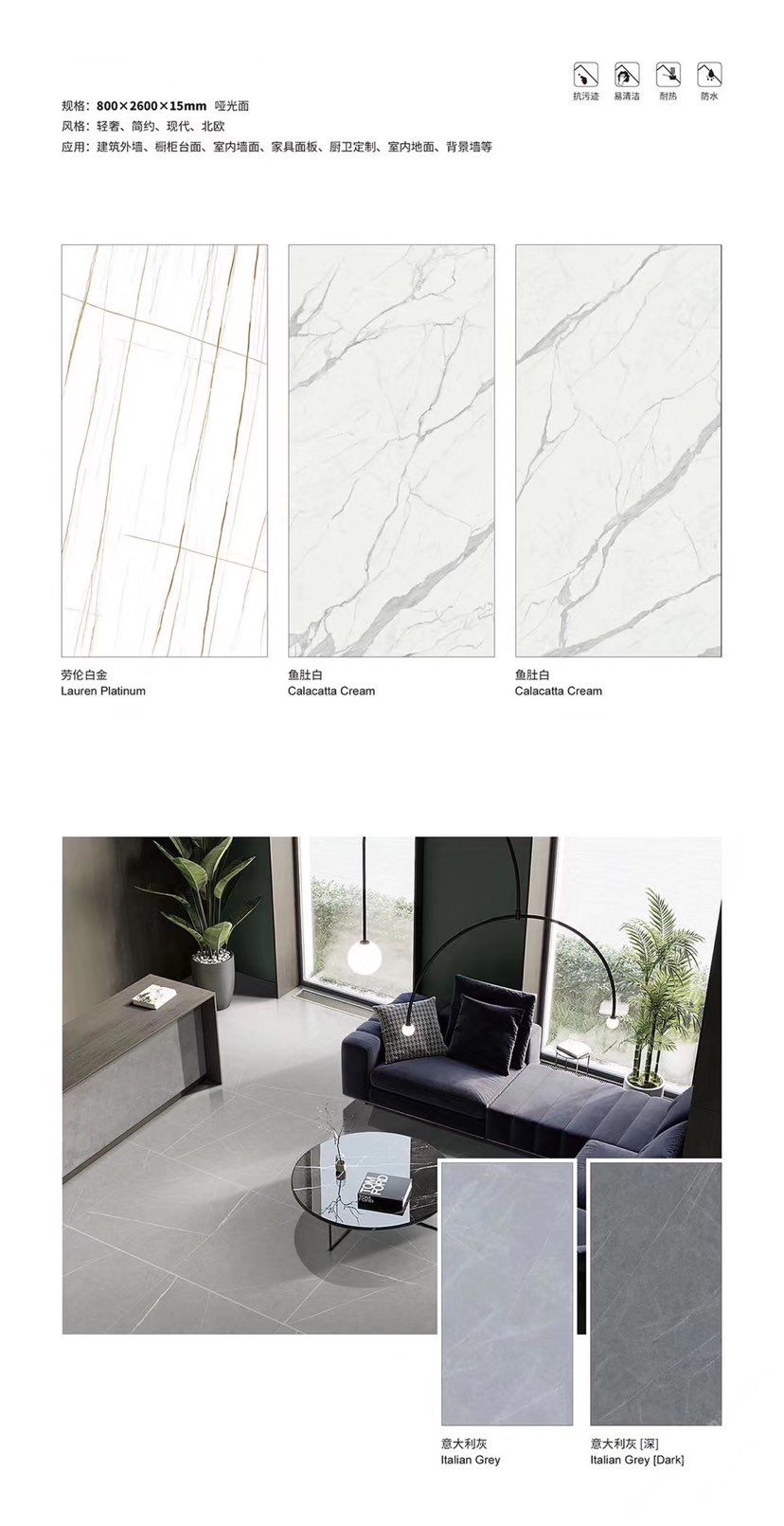 發(fā)布信息: ????SIBELAN 斯貝納巖板???? ????意大利設(shè)計師精選巖板???? 我們可以幫老總您加工為成品, 全國范圍內(nèi)可安排專業(yè)團隊安裝. 做到您一次性采購 省心. 放心. 省時. 低價! 巖板紋路版面全多達199 款 勵志做服務(wù)五星的巖板專業(yè)供應(yīng)商 魚肚白 雪花白 格蘭云天 寒江雪 爵士白 幻影灰 勞倫黑金 火山灰 亞馬遜 艾維拉 羅馬黑檀 貝特巖 細花白 羅馬灰 云朵拉灰 魚肚金 莎羅娜 莎羅蘭 勞倫白金 拉薩白 中花白 灰冰玉 卡拉拉白 撒金黑 清水玉 薩瓦灰 莎士比亞 大花灰 白冰玉 銀灰洞 阿瑪尼灰 綠紋玉 綠冰玉 藍紋玉 保加利亞灰 鐵銹 黑木紋 流砂灰 純白 純灰 純黑 TEL: 15905069590 聶 各種版面規(guī)格全部如下: 1200×600×11mm 啞光 1500×800×11mm 啞光 1800×900×11mm 啞光 1800×900×12mm 啞光 2600×800×15mm 啞光 2400×1200×6mm 啞光/亮光 2400×1200×9mm 啞光/亮光 2400×1200×15mm 啞光 2700×1200×6mm 啞光/亮光 2700×1600×12mm 啞光/亮光 3200×1600×6mm 啞光/亮光 3200×1600×12mm 啞光/亮光