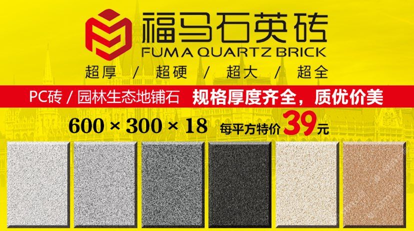 發(fā)布信息: ??福馬石英磚 ? 生態(tài)地鋪石創(chuàng)意源自于天然石材,品質(zhì)勝于天然石材。 以天然石粉、高嶺土、石英砂、長石等原料,經(jīng)研磨、混合制漿、干燥噴粉、壓制、多層施釉、燒結(jié),1250℃高溫使原材料產(chǎn)生熔融狀態(tài),冷卻后重組結(jié)晶。這使得生態(tài)石更加密實和堅硬。 ? 1、全瓷化通體材質(zhì),高瓷化度,低吸水率,使產(chǎn)品防滑、耐磨、高抗折、高耐污,清潔方便性。 ? 2、依據(jù)天然石材的表面,開具特殊模具表面,使生態(tài)地鋪石具有石材質(zhì)感,仿真度更高,更防滑,不同于普通廣場磚 ? 3、產(chǎn)品表面經(jīng)7道以上特殊釉水工藝處理,使產(chǎn)品具有耐磨、防滑,高耐污,清潔方便的特點。 ? 4、產(chǎn)品顏色豐富(量大可定制),尺寸多樣。能夠配合設(shè)計師獨特創(chuàng)意,實現(xiàn)不同環(huán)境和個性所要求的裝飾風(fēng)格。 ? 5、耐久性好,適合場所廣。產(chǎn)品具有耐磨抗壓、防滑耐污、耐酸堿、抗凍、不褪色的特點??捎糜诖笮拓涇嚳赏ㄐ械?,市政工程,小區(qū)景觀路面,休閑廣場,園林綠化,公園公共停車場等。 ? 6、后期養(yǎng)護(hù)、修補簡單。產(chǎn)品顏色可控,不同批次產(chǎn)品色差控制在95%左右,且常規(guī)顏色產(chǎn)品,長期備有庫存。