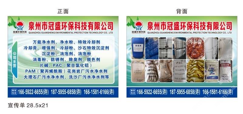 發(fā)布信息: 冠盛環(huán)??萍?6615816166 主營(yíng)產(chǎn)品:凈水劑,冷卻劑,冷卻粉,大理石人造石專用凈水劑,沉淀粉,消泡劑,消毒凈水劑,防銹凈水劑,除銹劑,除臭劑,聚丙烯酰胺,聚合氯化鋁,鹵精,洗沙專用凈水劑,壓濾機(jī)專用凈水劑,陶瓷廠專用凈水劑(黃藥 白藥)等所有水處理環(huán)保材料……
